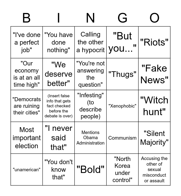 This bingo card has a free space and 24 words: "I never said that", "You don't know that", "You're not answering the question", "unamerican", "Riots", "I've done a perfect job", "Our economy is at an all time high", "You have done nothing", "Xenophobic", Mentions Obama Administration, "Thugs", "Democrats are ruining their cities", Communism, "Silent Majority", "We deserve better", "North Korea under control", "Witch hunt", Calling the other a hypocrit, "Fake News", (Insert false info that gets fact checked before the debate is over), Accusing the other of sexual misconduct or assault, Most important election, "But you..." and "Bold".