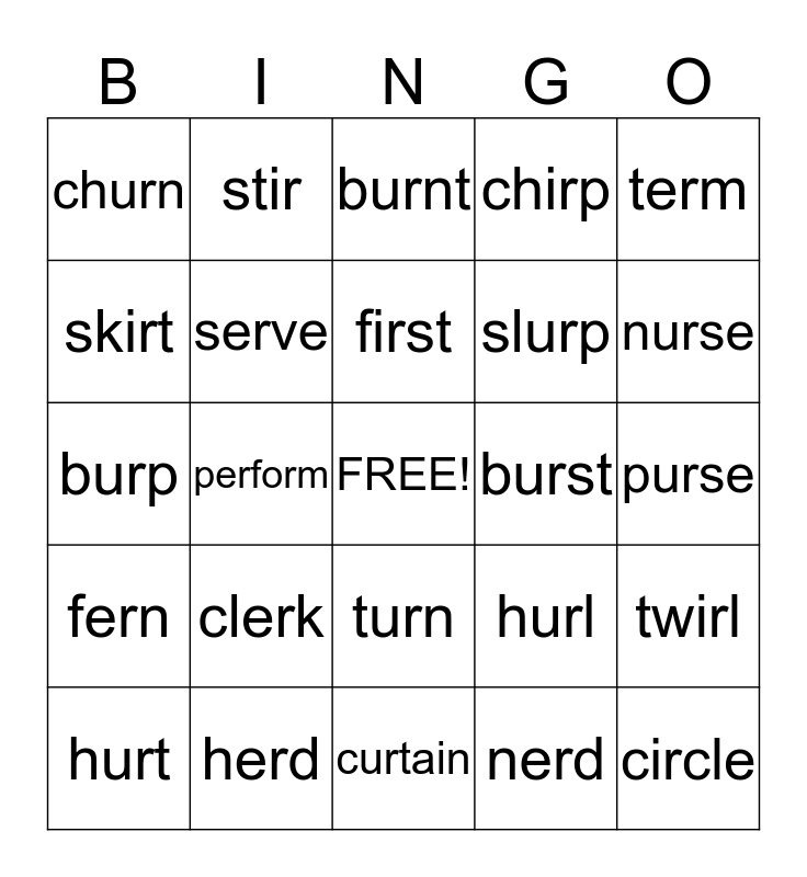 This bingo card has a free space and 24 words: clerk, herd, first, hurt, term, churn, skirt, stir, burst, turn, slurp, burp, hurl, twirl, serve, nerd, purse, burnt, nurse, perform, circle, fern, chirp and curtain.