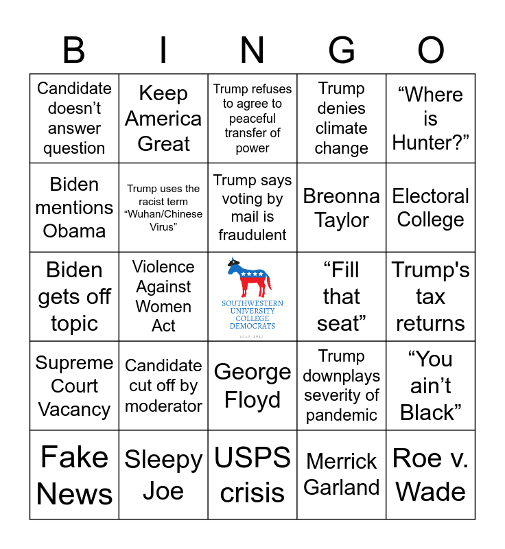 This bingo card has a free space and 59 words: Build Back Better, Sleepy Joe, Senate Filibuster, Supreme Court Vacancy, Merrick Garland, "Crooked Hillary", Trump uses the racist term “Wuhan/Chinese Virus”, Black Lives Matter, Breonna Taylor, Trump calls protests “riots”, Trump denies climate change, Trump says Biden wants to defund the police, Biden mentions Obama, Nancy Pelosi, Trump rolls his eyes, Candidate doesn’t answer question, Roe v. Wade, “Where is Hunter?”, Trump says “nobody thought it was possible”, Trump says voting by mail is fraudulent, “Fill that seat”, Trump refuses to agree to peaceful transfer of power, Fake News, “You ain’t Black”, Malarkey, Dr. Fauci, Pre-existing conditions, ACA/ Obamacare, Electoral College, Mandatory Mask Mandate, Vaccines, “Looting/ rioting/ anarchists"”, Antifa, Law & Order, Keep America Great, “Biden’s America”, 1994 Crime Bill, Violence Against Women Act, Reproductive Freedom, Biden gets off topic, “Open the economy”, Candidate cut off by moderator, Trump's tax returns, Trump says election will be rigged, Gun control, Ruth Bader Ginsburg, Jacob Blake, Portland, George Floyd, USPS crisis, "Here's the deal", 2nd amendment, "Look at my record", "C'mon, man!", Trump claims he brought peace to the middle east, Trump downplays severity of pandemic, Amy Coney Barrett, Russia meddling in election and Trump breathes'sniffs into microphone.