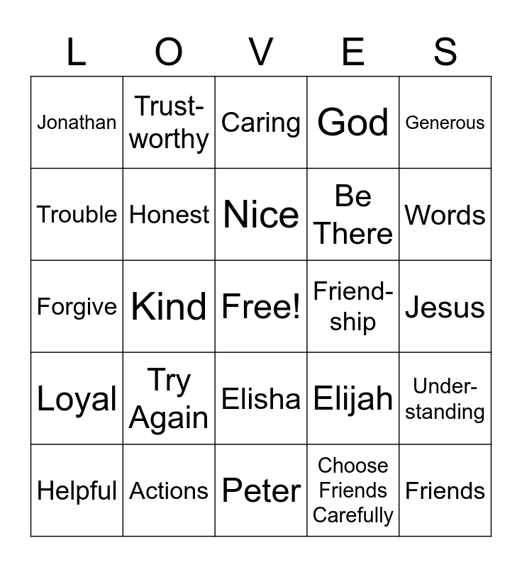 This bingo card has a free space and 34 words: You Can Do This!, Choose Friends Carefully, I Believe You, How Can I Help You, Loyal, Honest, Generous, Helpful, Trust- worthy, Happy, Nice, Caring, Encou- raging, Loves, Friend- ship, Words, Actions, Forgive, Try Again, Elijah, Elisha, David, Jonathan, Jesus, Peter, Friends, God, Pray, Be There, Trouble, Treat Others, Kind, Under- standing and Listen.