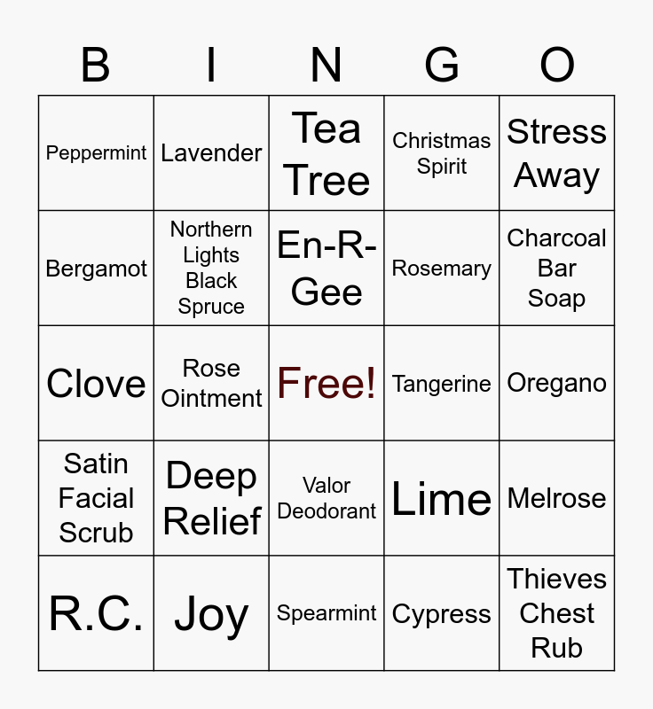 This bingo card has a free space and 24 words: R.C., Deep Relief, En-R-Gee, Cypress, Stress Away, Peppermint, Lavender, Tea Tree, Tangerine, Oregano, Clove, Northern Lights Black Spruce, Lime, Melrose, Bergamot, Joy, Spearmint, Christmas Spirit, Charcoal Bar Soap, Satin Facial Scrub, Rose Ointment, Valor Deodorant, Rosemary and Thieves Chest Rub.