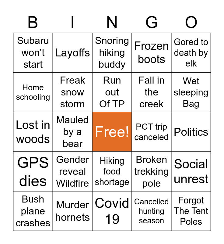 This bingo card has a free space and 24 words: Gender reveal Wildfire, Murder hornets, Run out Of TP, Bush plane crashes, Gored to death by elk, Subaru won’t start, Home schooling, Layoffs, PCT trip canceled, Hiking food shortage, Fall in the creek, Lost in woods, Broken trekking pole, Social unrest, Freak snow storm, Cancelled hunting season, Politics, Snoring hiking buddy, Wet sleeping Bag, Mauled by a bear, Forgot The Tent Poles, GPS dies, Frozen boots and Covid 19.