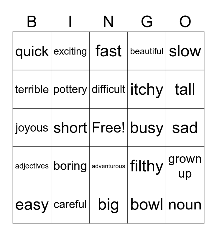 This bingo card has a free space and 24 words: boring, careful, difficult, easy, slow, quick, terrible, exciting, busy, adventurous, itchy, joyous, filthy, grown up, pottery, bowl, sad, fast, tall, short, noun, adjectives, beautiful and big.