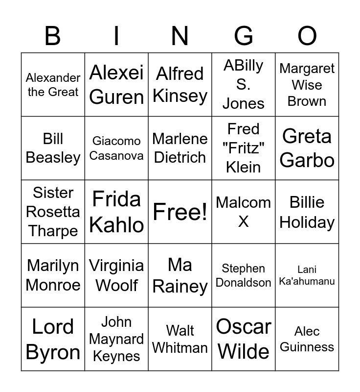 This bingo card has a free space and 29 words: Lord Byron, Josephine Baker, Frida Kahlo, Alexander Hamilton, Alexander the Great, Alfred Kinsey, Giacomo Casanova, Virginia Woolf, Malcom X, John Maynard Keynes, Billie Holiday, Alec Guinness, Walt Whitman, Oscar Wilde, Greta Garbo, Eleanor Roosevelt, Ma Rainey, Marilyn Monroe, Margaret Wise Brown, Sister Rosetta Tharpe, Stephen Donaldson, "Mother of Pride" Brenda Howard, Fred "Fritz" Klein, Bill Beasley, ABilly S. Jones, Alexei Guren, Lani Ka'ahumanu, Marlene Dietrich and Janis Joplin.