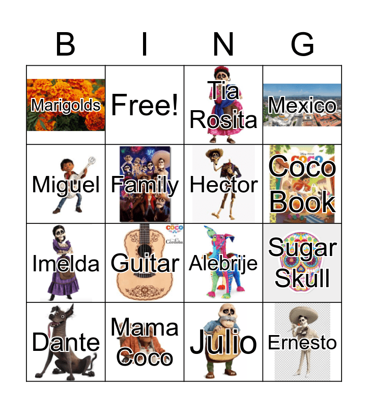 This bingo card has 18 images and 19 words: Alebrije, Abuelita, Tia Rosita, Ernesto, Sugar Skull, Miguel, Julio, Marigolds, Free!, Imelda, Guitar, Family, Hector, Mama Coco, Dante, Mariachi Band, Mexico, Coco Book and Dia De Los Muertos.