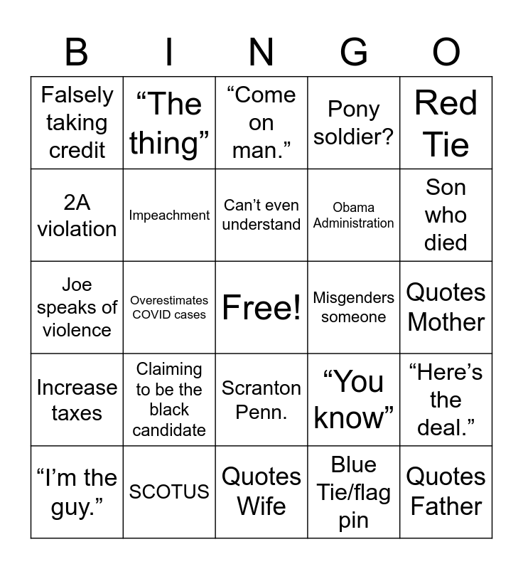 This bingo card has a free space and 24 words: “I’m the guy.”, Claiming to be the black candidate, Can’t even understand, Blue Tie/flag pin, Red Tie, Falsely taking credit, “The thing”, “Come on man.”, Misgenders someone, Quotes Mother, Joe speaks of violence, Impeachment, “You know”, “Here’s the deal.”, 2A violation, SCOTUS, Quotes Wife, Pony soldier?, Son who died, Increase taxes, Overestimates COVID cases, Scranton Penn., Obama Administration and Quotes Father.