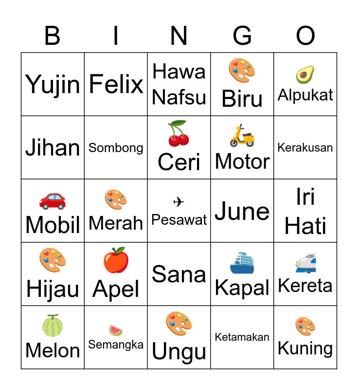 This bingo card has a free space and 24 words: ๐ Apel, ๐ Semangka, ๐ Ceri, ๐ Melon, ๐ฅ Alpukat, Yujin, Jihan, Felix, June, Sana, ๐ต Motor, ๐ Mobil, โด Kapal, ๐ Kereta, Sombong, Ketamakan, Iri Hati, Hawa Nafsu, Kerakusan, ๐จ Merah, ๐จ Kuning, ๐จ Hijau, ๐จ Biru and ๐จ Ungu.