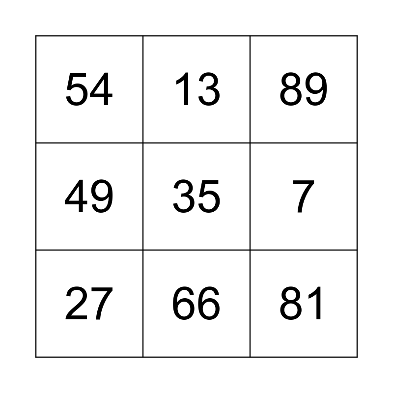This bingo card has a free space and 8 words: 7, 89, 13, 27, 54, 81, 49 and 66.