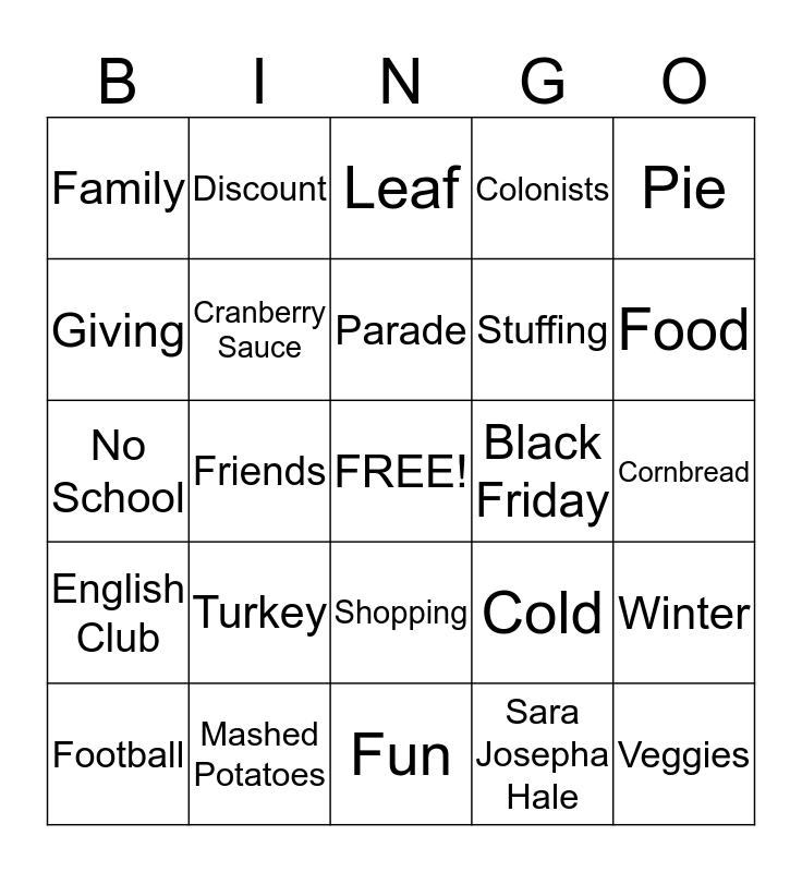 This bingo card has a free space and 24 words: Turkey, Mashed Potatoes, Parade, Football, Pie, Family, Giving, Discount, Black Friday, Shopping, Stuffing, No School, Cold, Winter, Cranberry Sauce, Sara Josepha Hale, Cornbread, Leaf, Food, Friends, Veggies, English Club, Colonists and Fun.