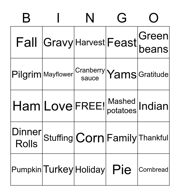 This bingo card has a free space and 24 words: Stuffing, Turkey, Cranberry sauce, Pumpkin, Green beans, Fall, Pilgrim, Gravy, Mashed potatoes, Corn, Yams, Ham, Family, Thankful, Mayflower, Pie, Indian, Harvest, Gratitude, Love, Cornbread, Dinner Rolls, Feast and Holiday.