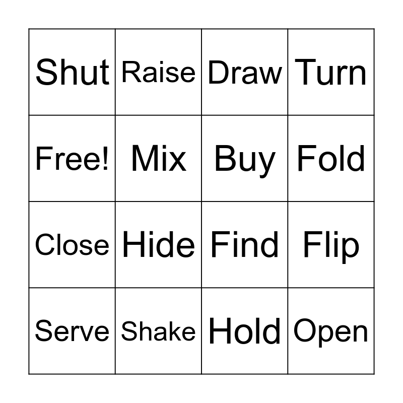 This bingo card has 16 words: Shake, Flip, Draw, Shut, Close, Raise, Find, Hold, Free!, Mix, Serve, Turn, Hide, Fold, Buy and Open.