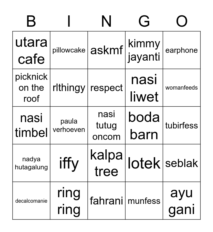 This bingo card has a free space and 24 words: iffy, ring ring, respect, decalcomanie, earphone, utara cafe, picknick on the roof, pillowcake, boda barn, kalpa tree, nasi liwet, nasi timbel, lotek, seblak, rlthingy, munfess, tubirfess, askmf, womanfeeds, paula verhoeven, ayu gani, nadya hutagalung, kimmy jayanti and fahrani.