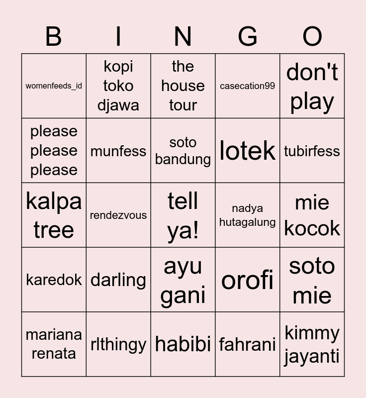 This bingo card has a free space and 24 words: darling, rlthingy, soto bandung, mariana renata, don't play, womenfeeds_id, please please please, kopi toko djawa, nadya hutagalung, ayu gani, lotek, kalpa tree, orofi, soto mie, munfess, fahrani, mie kocok, the house tour, tubirfess, rendezvous, kimmy jayanti, karedok, casecation99 and habibi.