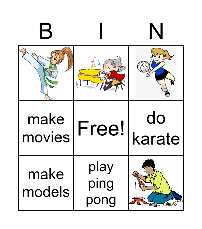 This bingo card has 10 images, a free space and 10 words: play the piano, play badminton, do karate, do gymnastics, make models, play the recorder, play ping pong, make movies, play the guitar and play volleyball.