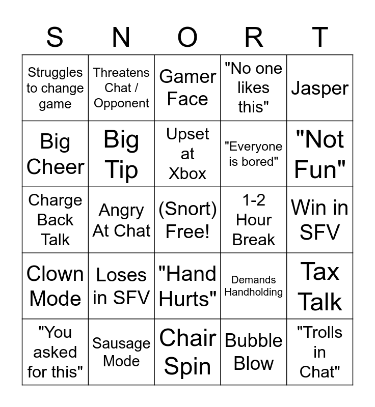 This bingo card has a free space and 39 words: Phil Bored, Skittle, "Lag", Big Tip, "You asked for this", "Hand Hurts", Upset at Xbox, "I like this game", Jasper, Clown Mode, Angry At Chat, "No one likes this", "Trolls in Chat", Win in SFV, 1-2 Hour Break, Loses in SFV, OBS Error, Struggles to change game, Kat Talk, Demands Handholding, Big Cheer, Chair Spin, "Everyone is bored", "Not Fun", Jasper Sprayed, Complains about Food, "Kat is at work", "Nothing I could do", Excessive Head Shaking, Threatens Chat / Opponent, "I had fun", "That was a dud", Gamer Face, Sausage Mode, Bubble Blow, Water Break, Tax Talk, Charge Back Talk and Bills.