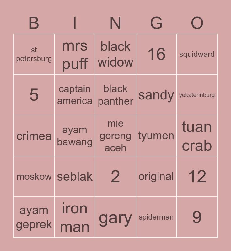 This bingo card has 25 words: seblak, gary, black panther, ayam geprek, squidward, st petersburg, 5, mrs puff, tyumen, 2, sandy, crimea, original, 12, captain america, 9, tuan crab, black widow, yekaterinburg, ayam bawang, mie goreng aceh, iron man, moskow, 16 and spiderman.
