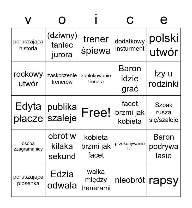 This bingo card has a free space and 24 words: obrót w kilaka sekund, Edzia odwala, zablokowanie trenera, poruszająca piosenka, polski utwór, poruszająca historia, rockowy utwór, (dziwny) taniec jurora, facet brzmi jak kobieta, kobieta brzmi jak facet, Baron idzie grać, Edyta płacze, przekonywanie Uli, Baron podrywa lasie, zaskoczenie trenerów, nieobrót, Szpak rusza się/szaleje, trener śpiewa, łzy u rodzinki, publika szaleje, rapsy, osoba zzagramanicy, dodatkowy insturment and walka między trenerami.