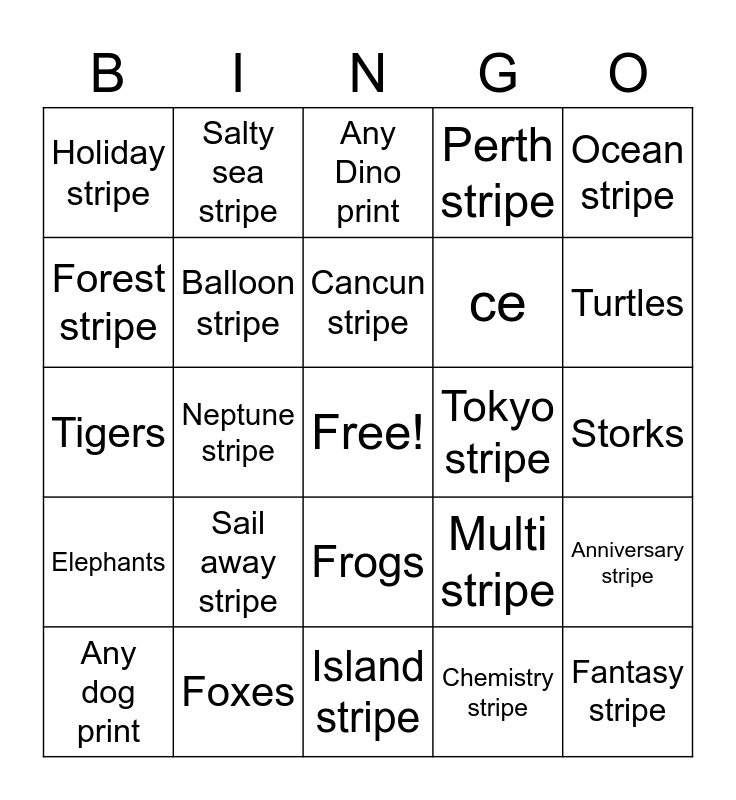 This bingo card has a free space and 49 words: Meteorology stripe, Fantasy stripe, Animal stripe, Island stripe, Sail away stripe, Bobsled stripe, Salty sea stripe, Space stripe, Forest stripe, Bubblegum stripe, Balloon stripe, Perth stripe, Anniversary stripe, Multi stripe, Fairytale stripe, Midnight stripe, Cancun stripe, Tokyo stripe, musical Stripe, Ocean stripe, Neptune stripe, Chemistry stripe, Holiday stripe, ce, Hippos, Turtles, Any dog print, Hedgehogs, Frogs, Elephants, Whales, Megas/Sharks, Jellyfish, Cows, Foxes, Roosters, Crocs/Alligators, Labs, Storks, Trout, Ladybugs, Glass beetles/Scarab, Bunnies/Hares, Cheetah, Tigers, Any Dino print, Moose, Pigs and Deer.