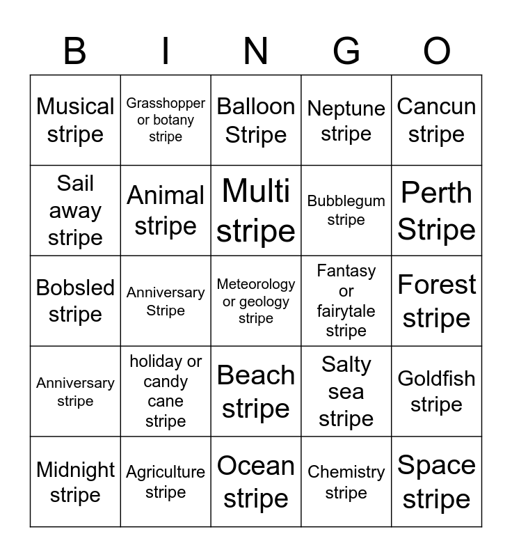 This bingo card has 25 words: holiday or candy cane stripe, Ocean stripe, Multi stripe, Midnight stripe, Cancun stripe, Musical stripe, Sail away stripe, Grasshopper or botany stripe, Fantasy or fairytale stripe, Beach stripe, Bubblegum stripe, Bobsled stripe, Salty sea stripe, Goldfish stripe, Animal stripe, Space stripe, Forest stripe, Balloon Stripe, Perth Stripe, Anniversary Stripe, Meteorology or geology stripe, Agriculture stripe, Anniversary stripe, Neptune stripe and Chemistry stripe.