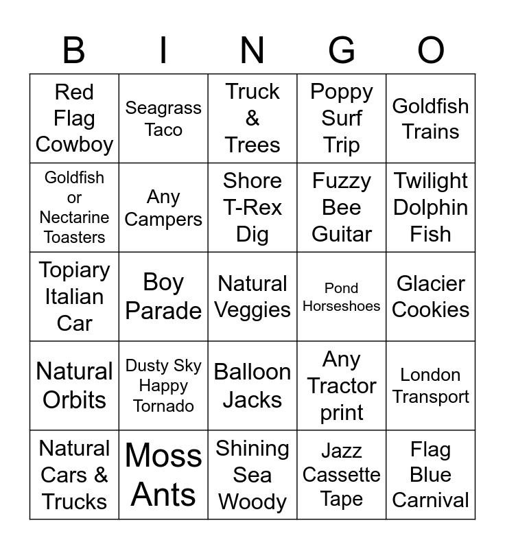 This bingo card has 25 words: Dusty Sky Happy Tornado, Shining Sea Woody, Shore T-Rex Dig, Natural Cars & Trucks, Goldfish Trains, Red Flag Cowboy, Goldfish or Nectarine Toasters, Seagrass Taco, Pond Horseshoes, Balloon Jacks, Fuzzy Bee Guitar, Topiary Italian Car, Any Tractor print, London Transport, Any Campers, Flag Blue Carnival, Glacier Cookies, Truck & Trees, Twilight Dolphin Fish, Boy Parade, Natural Veggies, Moss Ants, Natural Orbits, Poppy Surf Trip and Jazz Cassette Tape.