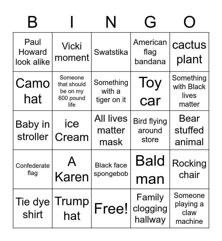This bingo card has 25 words: Confederate flag, Trump hat, All lives matter mask, Family clogging hallway, cactus plant, Paul Howard look alike, Vicki moment, Swatstika, Bird flying around store, Rocking chair, Camo hat, Someone that should be on my 600 pound life, Free!, Bald man, Something with Black lives matter, Tie dye shirt, ice Cream, Something with a tiger on it, Toy car, Bear stuffed animal, Baby in stroller, A Karen, Black face spongebob, American flag bandana and Someone playing a claw machine.