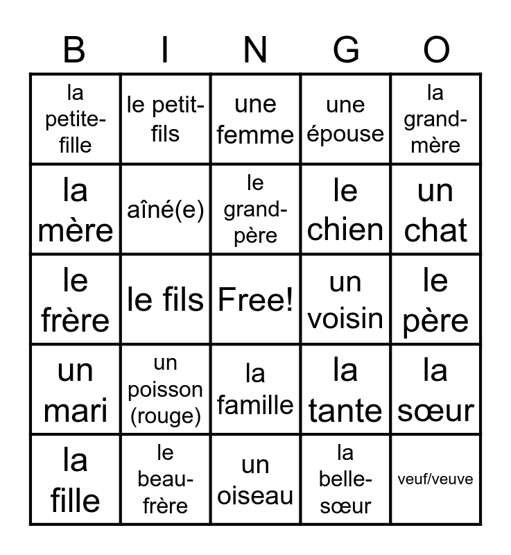 This bingo card has a free space and 26 words: la famille, la belle-sœur, le grand-père, le beau-frère, la grand-mère, la petite-fille, la mère, le petit-fils, le père, la tante, le chien, le frère, la sœur, la fille, le fils, un époux, une épouse, un mari, une femme, veuf/veuve, un chat, un oiseau, un voisin, un poisson (rouge), aîné(e) and cadet(te).
