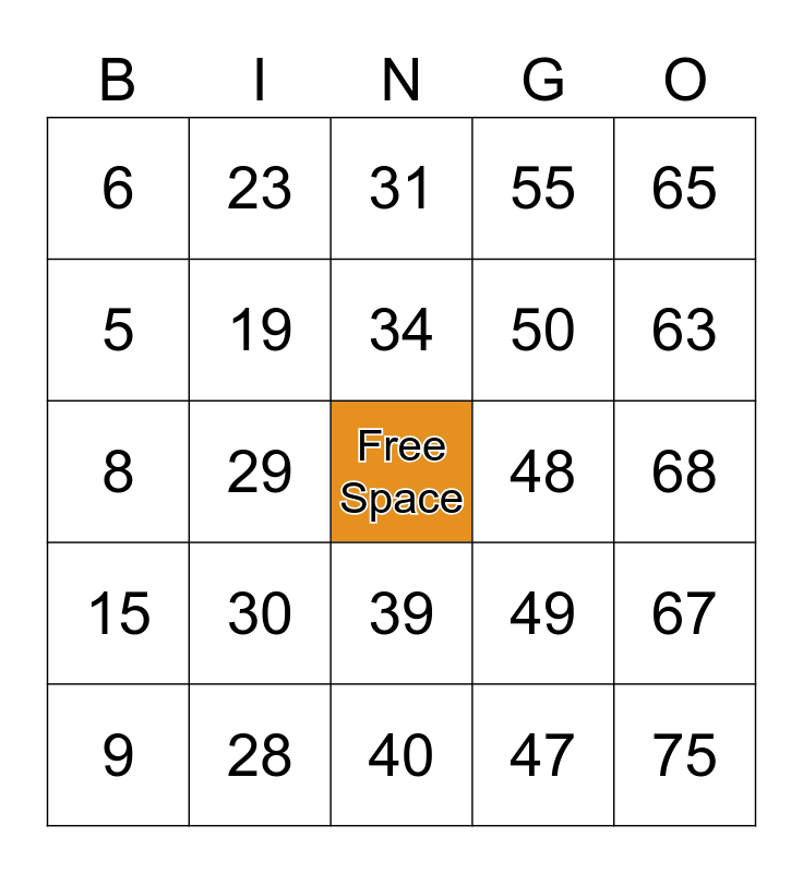 This bingo card has a free space and 75 words: 1, 16, 31, 46, 61, 2, 17, 32, 47, 62, 3, 18, 48, 63, 4, 19, 33, 49, 64, 5, 20, 34, 50, 65, 6, 21, 35, 51, 66, 7, 22, 36, 52, 67, 8, 23, 37, 53, 68, 9, 24, 38, 54, 69, 10, 25, 39, 55, 70, 11, 26, 40, 56, 71, 12, 27, 41, 57, 72, 13, 28, 42, 58, 73, 14, 29, 43, 59, 74, 15, 30, 44, 60, 75 and 45.