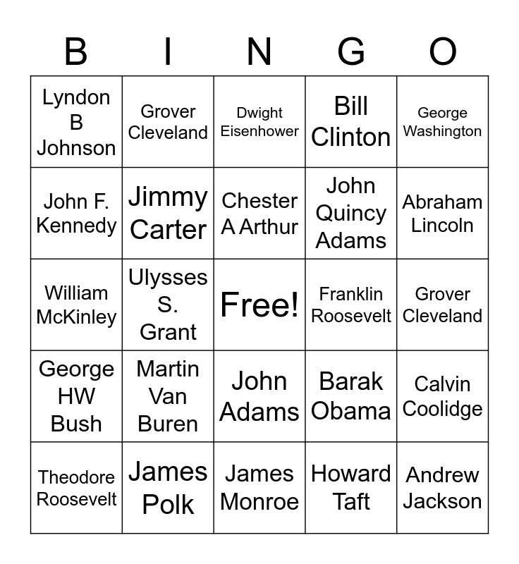 This bingo card has a free space and 24 words: Martin Van Buren, James Polk, Chester A Arthur, Theodore Roosevelt, George Washington, Lyndon B Johnson, John F. Kennedy, Grover Cleveland, Franklin Roosevelt, John Adams, John Quincy Adams, William McKinley, Barak Obama, Calvin Coolidge, Jimmy Carter, Howard Taft, Grover Cleveland, Dwight Eisenhower, Abraham Lincoln, Ulysses S. Grant, Andrew Jackson, George HW Bush, Bill Clinton and James Monroe.