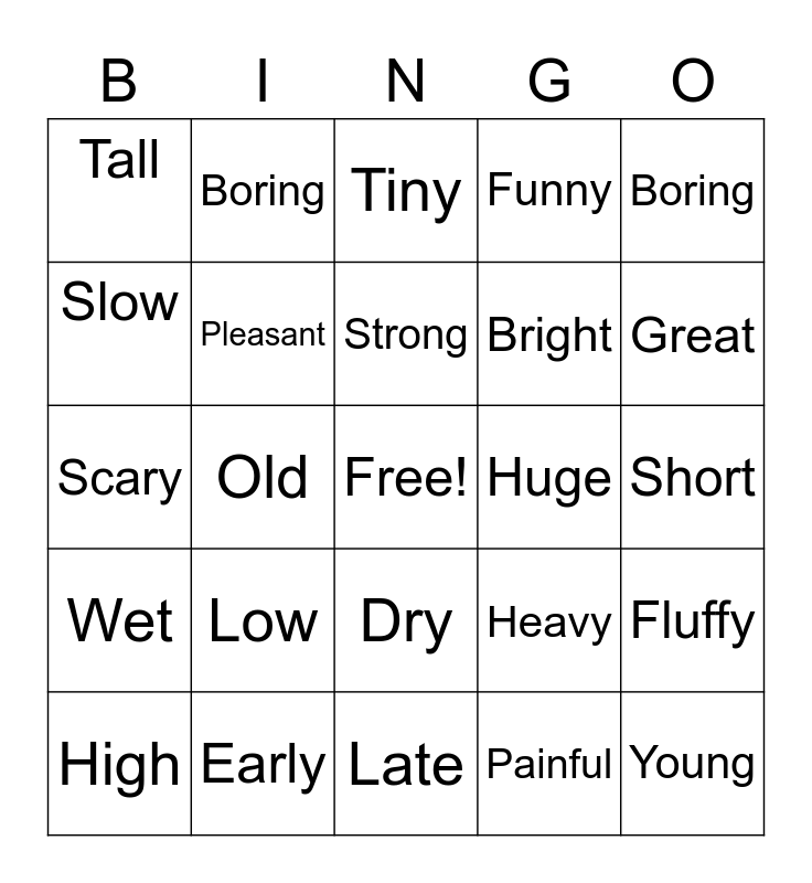 This bingo card has a free space and 29 words: High, Best, Old, Soft, Tall, Tiny, Pleasant, Low, Huge, Early, Short, Young, Late, Painful, Great, New, Dry, Wet, Boring, Scary, Heavy, Light, Bright, Slow, Funny, Boring, Fluffy, Strong and Weak.