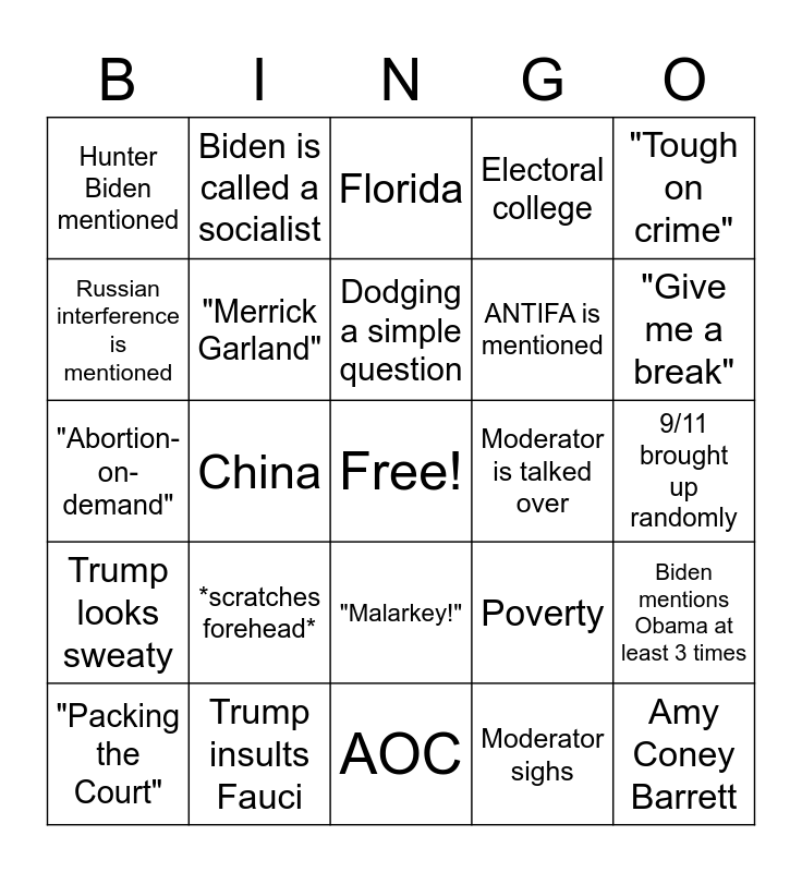 This bingo card has a free space and 64 words: RBG is mentioned, Red tie, Trump brings up Hillary, Biden mentions Obama at least 3 times, Trump refuses to say he'll accept results, Trump's tax returns are mentioned, Biden is called a socialist, Blue Tie, Dodging a simple question, "The 1%", "Malarkey!", Trump walks in circles, 9/11 brought up randomly, "Tough on crime", "Sleepy Joe", Russian interference is mentioned, China, Hunter Biden mentioned, "America first!", ANTIFA is mentioned, *scratches forehead*, Trump looks sweaty, Electoral college, Pre-existing conditions, Early voting, Mask worn incorrectly, Fight for Democratic Senate mentioned, Donald Trump Jr. is mentioned, Charlottesville is mentioned, Bill Clinton mentioned, "unprecedented", Access Hollywood Tape, Kamala is mentioned, "Benghazi", "Give me a break", "Packing the Court", A technical issue happens, Moderator sighs, Trump denies he said something that he said, "Merrick Garland", "Abortion-on-demand", Moderator is talked over, Someone ignores the timer, Trump acts arrogant, Trump brings up TV ratings, Amy Coney Barrett, Trump insults Fauci, NATO, Poverty, SAD!, Popular vote, ACA, AOC, Vote by mail, Texas, Rudy Giuliani, Florida, Bush v Gore, Biden tells a story, 2016 results are mentioned, "Shut up!", Biden literally starts fighting Trump, "Listen to the scientists" and Bernie Sanders.