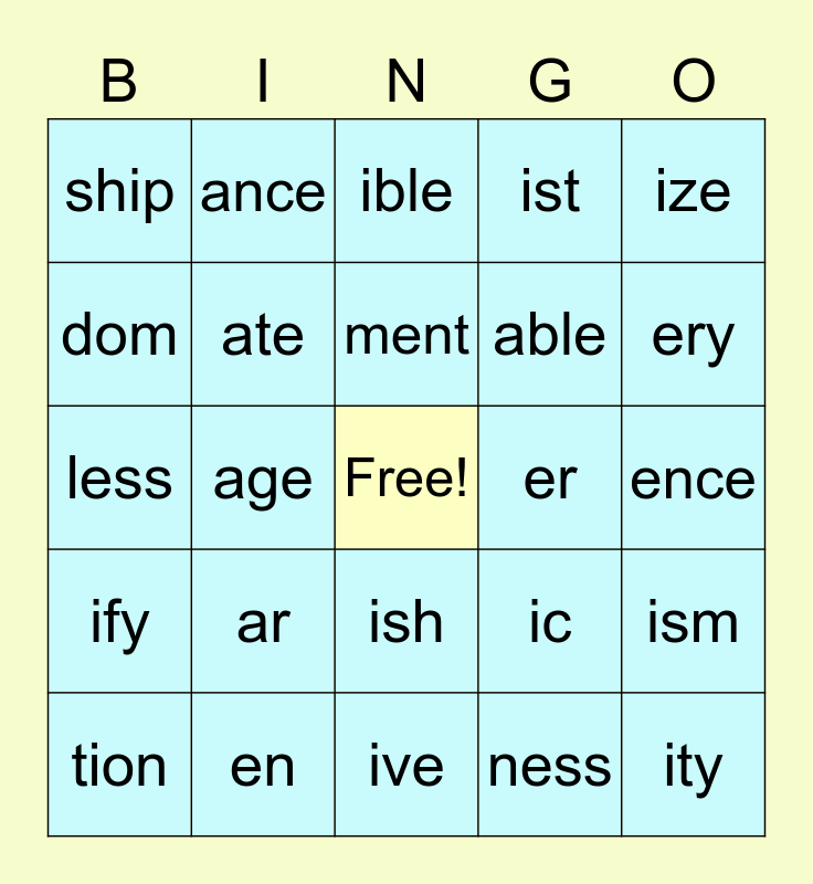 This bingo card has a free space and 24 words: ar, en, ment, tion, ize, ship, dom, ance, er, ish, able, less, ic, ism, ate, ness, ence, ible, ery, age, ity, ify, ist and ive.