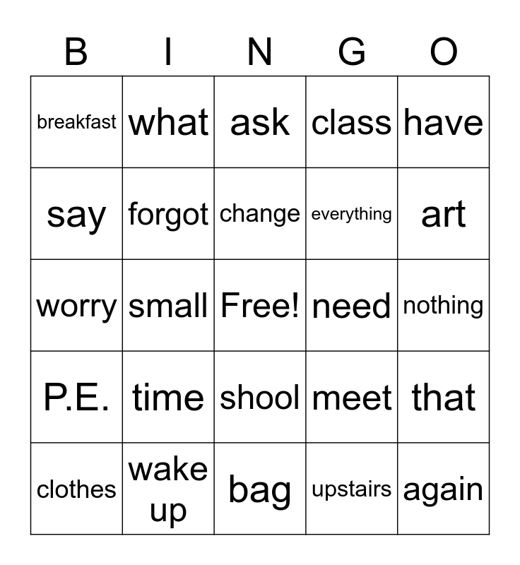 This bingo card has a free space and 24 words: time, wake up, change, clothes, have, breakfast, say, what, need, shool, everything, worry, meet, that, forgot, upstairs, nothing, ask, art, small, again, P.E., class and bag.