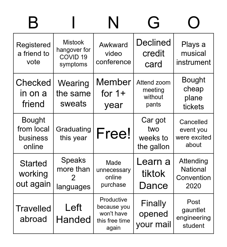 This bingo card has a free space and 24 words: Speaks more than 2 languages, Left Handed, Member for 1+ year, Travelled abroad, Plays a musical instrument, Registered a friend to vote, Checked in on a friend, Mistook hangover for COVID 19 symptoms, Car got two weeks to the gallon, Made unnecessary online purchase, Attend zoom meeting without pants, Bought from local business online, Learn a tiktok Dance, Attending National Convention 2020, Wearing the same sweats, Finally opened your mail, Cancelled event you were excited about, Awkward video conference, Bought cheap plane tickets, Graduating this year, Post gauntlet engineering student, Started working out again, Declined credit card and Productive because you won't have this free time again.