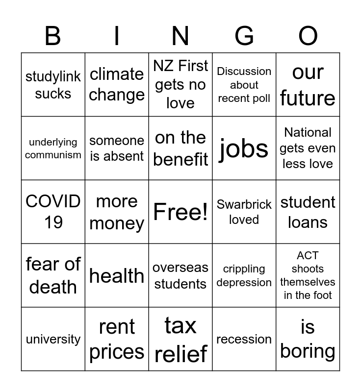 This bingo card has a free space and 24 words: health, rent prices, on the benefit, university, our future, studylink sucks, underlying communism, climate change, Swarbrick loved, overseas students, jobs, COVID 19, crippling depression, ACT shoots themselves in the foot, someone is absent, recession, student loans, NZ First gets no love, National gets even less love, more money, is boring, fear of death, Discussion about recent poll and tax relief.