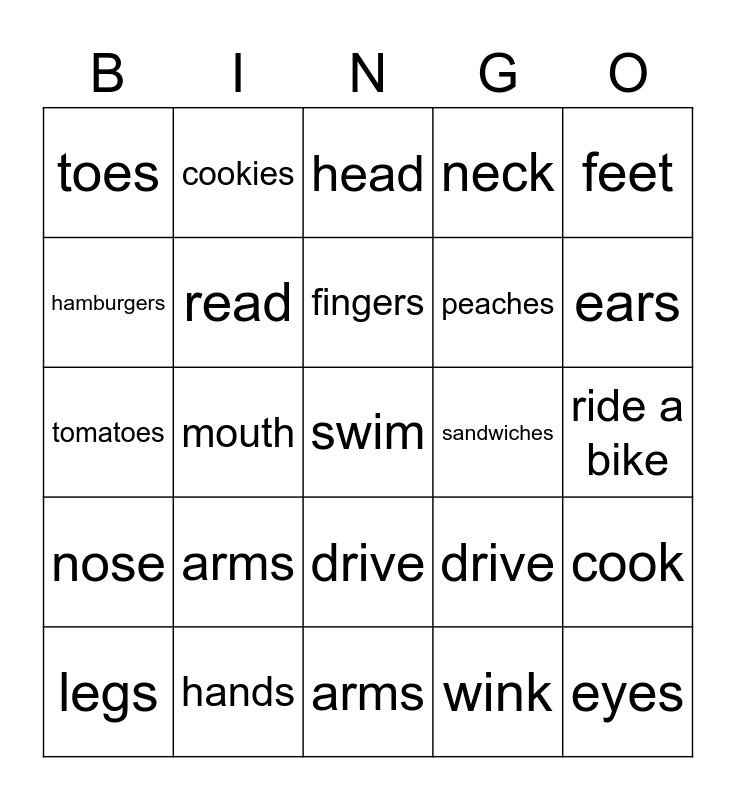 This bingo card has a free space and 24 words: arms, hands, fingers, legs, feet, toes, hamburgers, cookies, sandwiches, drive, peaches, tomatoes, drive, cook, read, wink, ride a bike, head, ears, mouth, eyes, nose, neck and arms.