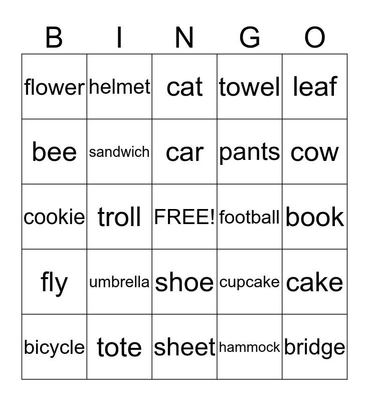 This bingo card has a free space and 24 words: umbrella, tote, car, bicycle, leaf, flower, bee, helmet, football, shoe, pants, cookie, cupcake, cake, sandwich, hammock, book, cat, cow, troll, bridge, fly, towel and sheet.