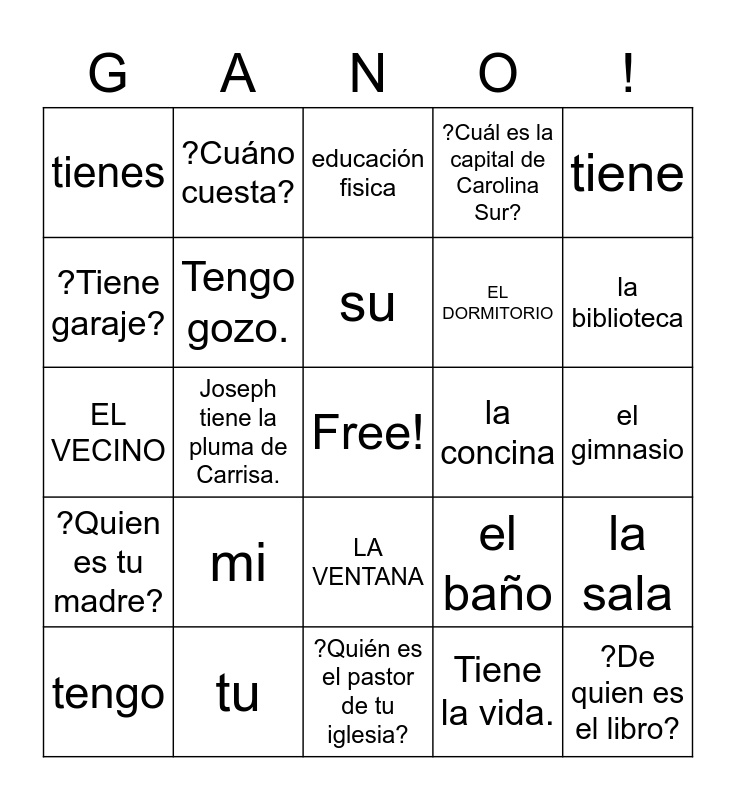 This bingo card has a free space and 24 words: mi, tu, su, tengo, tiene, tienes, ?Tiene garaje?, ?Cuáno cuesta?, la concina, LA VENTANA, EL DORMITORIO, EL VECINO, el baño, la sala, Tengo gozo., Tiene la vida., el gimnasio, educación fisica, la biblioteca, Joseph tiene la pluma de Carrisa., ?De quien es el libro?, ?Quien es tu madre?, ?Cuál es la capital de Carolina Sur? and ?Quién es el pastor de tu iglesia?.