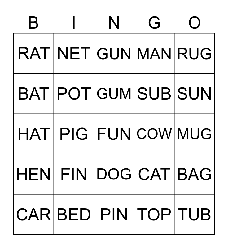 This bingo card has a free space and 24 words: CAR, FIN, GUM, TOP, RUG, RAT, NET, GUN, COW, MUG, HAT, POT, CAT, BAG, BAT, BED, PIN, MAN, SUN, HEN, PIG, DOG, SUB and TUB.