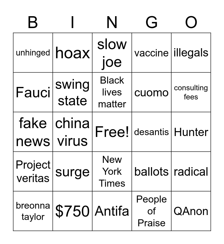 This bingo card has a free space and 29 words: breonna taylor, taxes, china virus, defund the police, unhinged, slow joe, swing state, surge, desantis, $750, Hunter, QAnon, Antifa, People of Praise, consulting fees, peaceful transition, New York Times, Project veritas, illegals, fake news, ballots, southern district of new york, cuomo, Fauci, vaccine, hoax, radical, Black lives matter and Barr.