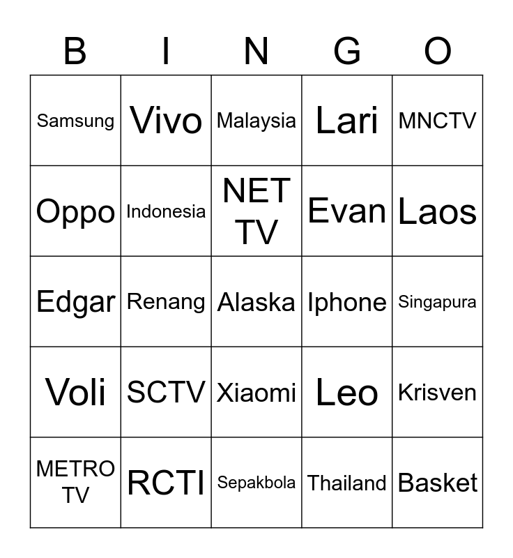 This bingo card has a free space and 24 words: SCTV, RCTI, NET TV, METRO TV, MNCTV, Samsung, Oppo, Vivo, Iphone, Xiaomi, Evan, Edgar, Leo, Krisven, Indonesia, Thailand, Singapura, Malaysia, Laos, Renang, Basket, Voli, Lari and Sepakbola.