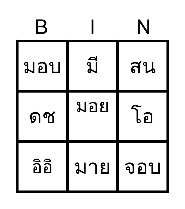 This bingo card has a free space and 24 words: มด, กบ, มาย, เอ๋ย, จอบ, มอบ, โอ, มี, จน, พา, หา, Free!, ทำ, ไม, อิอิ, มา, ได้, สน, โน, นินิ, งาม, เลิซ, ดช and กก.