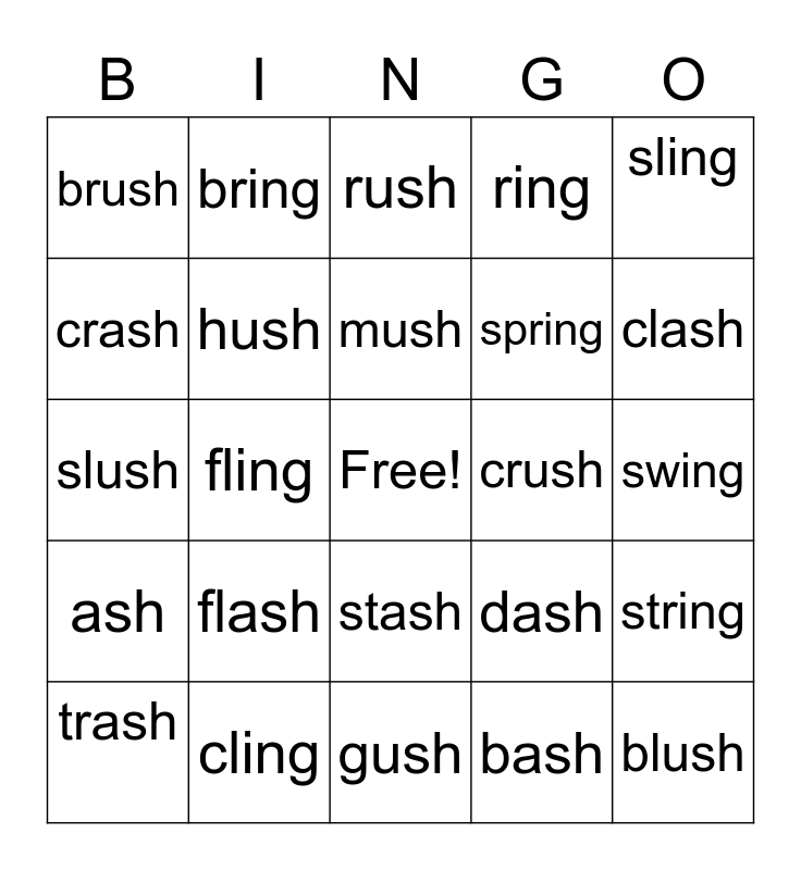 This bingo card has a free space and 24 words: flash, cling, mush, trash, sling, brush, crash, bring, crush, stash, spring, slush, dash, string, hush, bash, swing, rush, clash, fling, blush, ash, ring and gush.