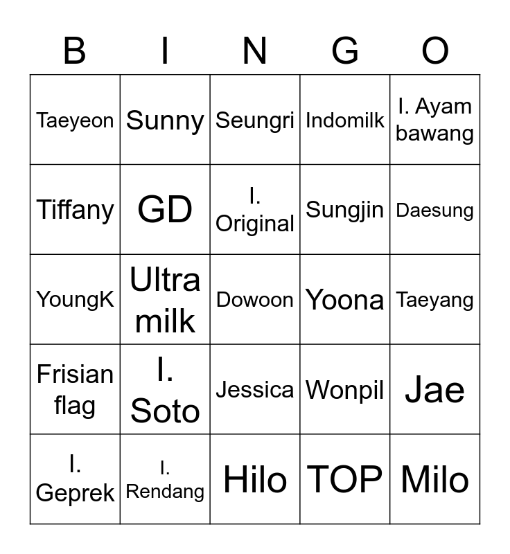 This bingo card has a free space and 24 words: I. Soto, I. Rendang, I. Original, I. Geprek, I. Ayam bawang, Taeyeon, Tiffany, Sunny, Yoona, Jessica, Sungjin, YoungK, Wonpil, Jae, GD, TOP, Taeyang, Seungri, Daesung, Ultra milk, Milo, Frisian flag, Indomilk and Hilo.