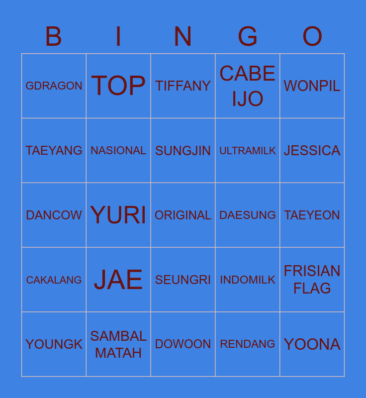 This bingo card has 25 words: JAE, DOWOON, SUNGJIN, YOUNGK, WONPIL, GDRAGON, TAEYANG, TOP, DAESUNG, SEUNGRI, ULTRAMILK, DANCOW, INDOMILK, FRISIAN FLAG, NASIONAL, YOONA, TAEYEON, TIFFANY, JESSICA, YURI, ORIGINAL, SAMBAL MATAH, CAKALANG, CABE IJO and RENDANG.