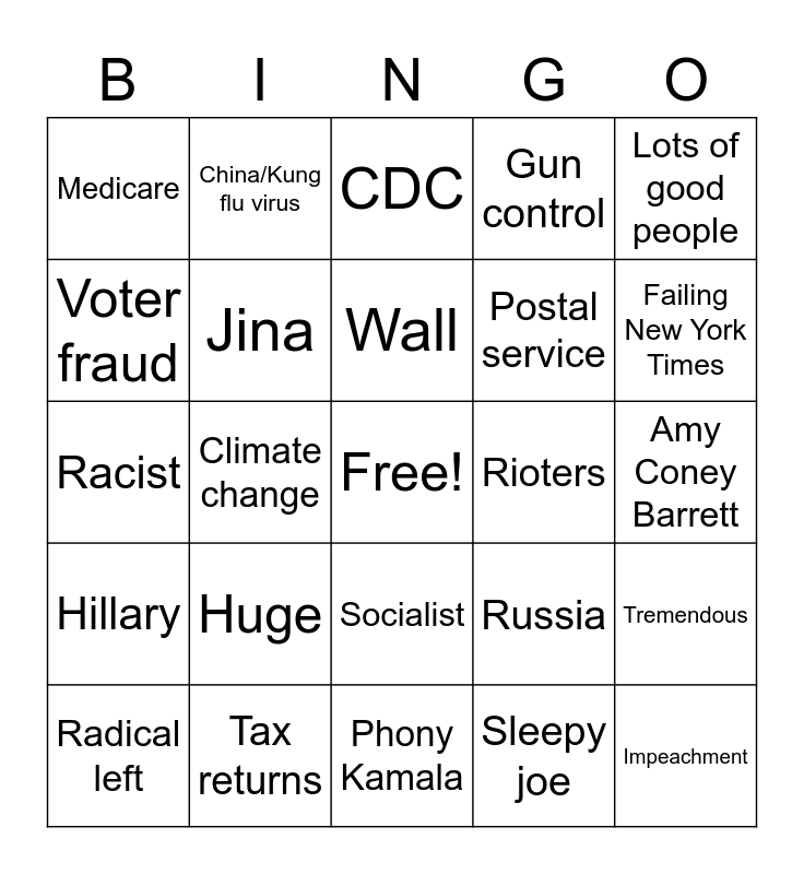 This bingo card has a free space and 32 words: Sleepy joe, Immigration, Climate change, Obama, Hillary, Jina, Lots of good people, Tremendous, China/Kung flu virus, Mask, Wall, CDC, Thugs, Fauci, Rioters, Antifa, Radical left, Racist, Socialist, Huge, Russia, Hunter Biden, Amy Coney Barrett, Tax returns, Impeachment, Gun control, Postal service, Voter fraud, Medicare, Phony Kamala, Polls and Failing New York Times.