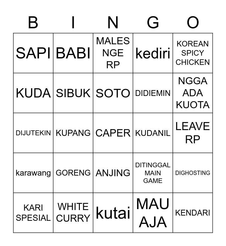 This bingo card has a free space and 24 words: GORENG, WHITE CURRY, SOTO, KARI SPESIAL, KOREAN SPICY CHICKEN, SAPI, KUDA, BABI, KUDANIL, ANJING, DIDIEMIN, DIJUTEKIN, DITINGGAL MAIN GAME, DIGHOSTING, SIBUK, MAU AJA, LEAVE RP, MALES NGE RP, NGGA ADA KUOTA, KUPANG, KENDARI, karawang, kediri and kutai.