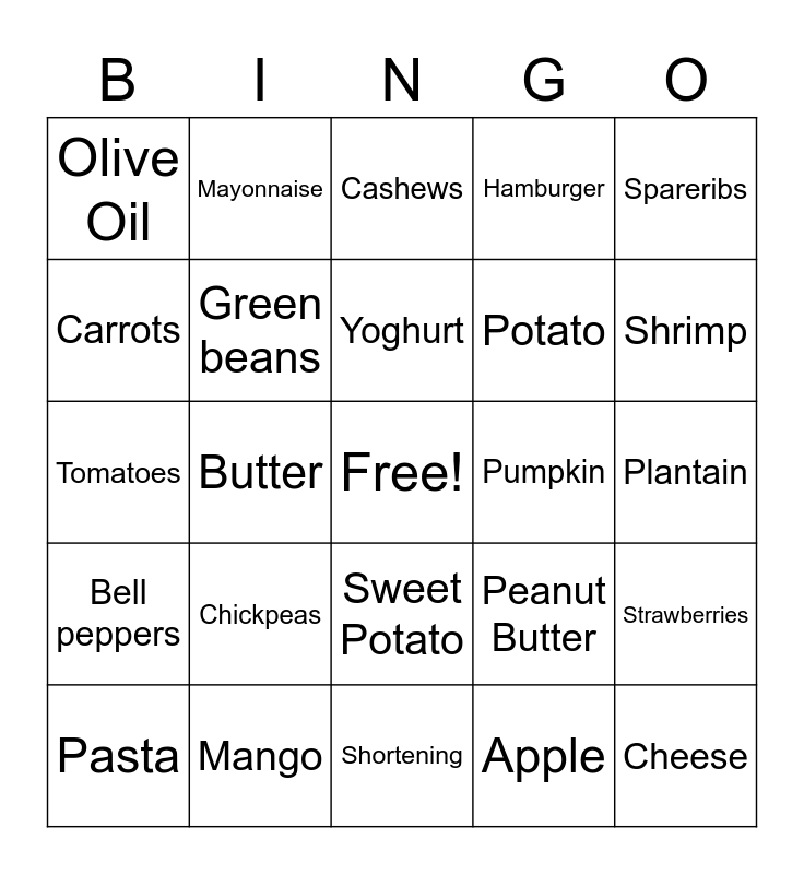 This bingo card has a free space and 39 words: Eggs, Brown rice, Chicken, Green beans, Pasta, Sweet Potato, Yoghurt, Quinoa, Spareribs, Bell peppers, Butter, Hamburger, Cheese, Plantain, Pumpkin, Chickpeas, Corn, Olive Oil, Oats, Peanut Butter, Carrots, Shortening, Potato, Shrimp, Gravy, Lentils, Tofu, Steak, Salmon, Mayonnaise, Iceberg lettuce, Bok choy, Cashews, Mango, Apple, Multigrain Bread, Strawberries, Tomatoes and Broccoli.