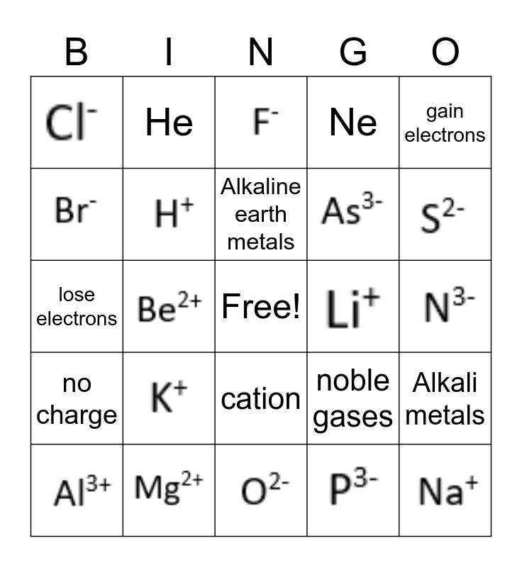 This bingo card has 17 images, a free space and 12 words: anion, cation, no charge, gain electrons, lose electrons, noble gases, 4+ or 4-, Ne, He, Alkali metals, Alkaline earth metals and Halogens.
