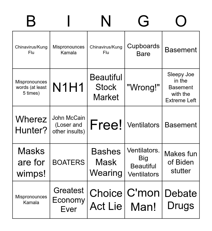 This bingo card has a free space and 44 words: Hunter Biden, Debate Drugs, Sleepy Joe, Mispronounces Kamala, MALARKEY, C'mon Man!, Chinavirus/Kung Flu, Fake News, Basement, Greatest Economy Ever, Cupboards Bare, Ventilators, Bashes Mask Wearing, BOATERS, Makes fun of Biden stutter, Choice Act Lie, "Sir" story, Wherez Hunter?, Joe Biden's Best Brain Pills and Nerve Tonic, Sleepy Joe in the Basement with the Extreme Left, Mispronounces Kamala, MALARKEY (None or Some), C'mon Man!, Chinavirus/Kung Flu, Fake News!, Basement, Greatest Economy Anyone Has Ever Seen, Cupboards Bare :(, Ventilators. Big Beautiful Ventilators, Masks are for wimps!, BOATERS. WE LOVE THEM., Makes fun of Biden stutter, Choice Act Lie, "Sir" story, John McCain (Loser and other insults), Pocahontas, ANTIFA / ANARCHISTS / DEMOCRAT CITIES OH MY!, The Squad, Beautiful Stock Market, Mispronounces words (at least 5 times), "Wrong!", Gungrabber Joe! Hide your kids, hide your wife, N1H1 and Perpetual Tax Audit.