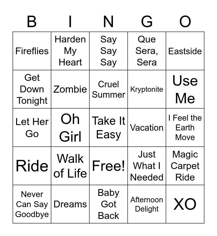 This bingo card has 26 words: Free!, Afternoon Delight, Cruel Summer, Dreams, Eastside, Fireflies, Get Down Tonight, Harden My Heart, I Feel the Earth Move, Just What I Needed, Kryptonite, Let Her Go, Magic Carpet Ride, Never Can Say Goodbye, Oh Girl, Pumped Up Kicks, Que Sera, Sera, Ride, Say Say Say, Take It Easy, Use Me, Baby Got Back, Vacation, Walk of Life, Zombie and XO.